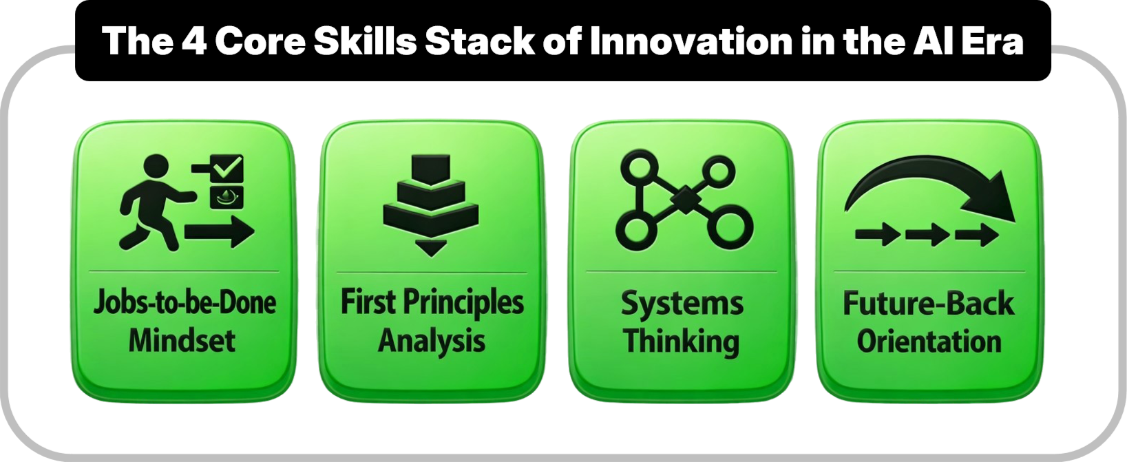 Not one who evolves existing products. Not one who layers AI onto yesterday’s solutions.But one who re-designs products from a clean sheet of paper for the AI-rich environment.They are the AI-Generation Innovators.They innovate by operating at a higher strategic and creative altitude, upstream of tools, roadmaps, and features.They focus on four core skills, namely: Jobs-to-Be-Done Thinking, First Principles Analysis, Systems Thinking, and Future-Back Orientation.With these, they are able to:• discard obsolete value propositions instead of optimizing them• reimagine offerings as AI-native, not digital-only• design solutions that assume intelligence, automation, and personalization by default• anticipate how roles, workflows, and markets will reorganize• create discontinuous innovation, not incremental differentiation.
